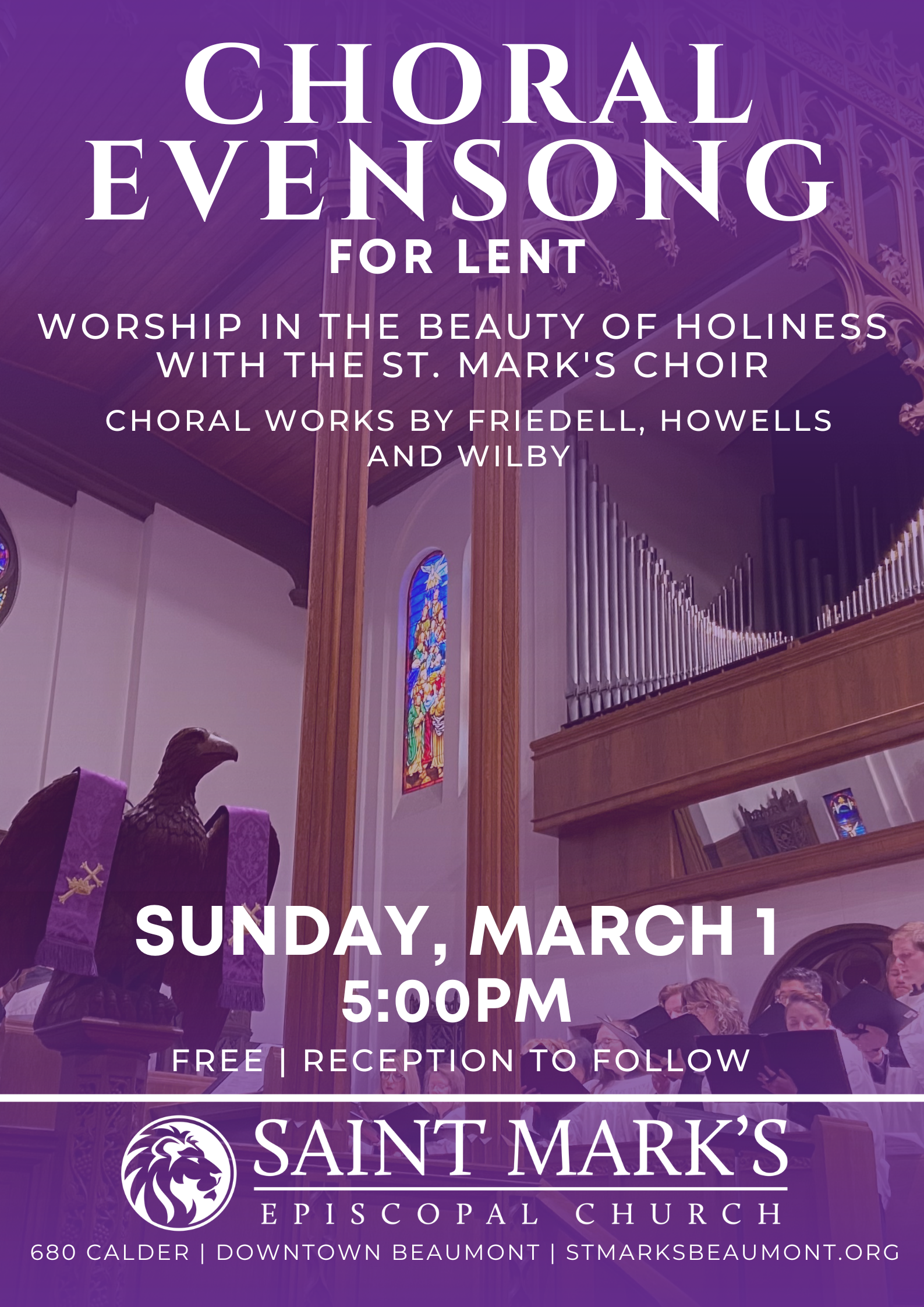 Worship in the Beauty of Holiness with the St. Mark's choir and clergy on 3/1 at 5PM